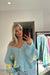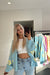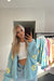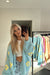 Das florale Design in Türkis und Gelb setzt wunderbar zu Jeanshosen in Szene und verleiht jedem Outfit einen eleganten Akzent.